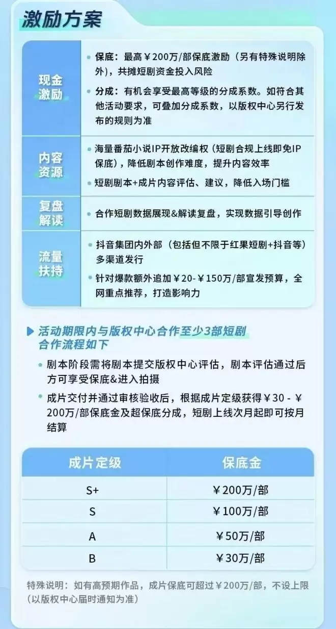 今年11月,抖音集团短剧版权中心还提出了常态化的影视机构专项成长计划,针对想入局竖屏微短剧的影视机构,开放海量番茄IP小说改编权,并提供最高200万/部的保底金额和最高等级的分成系数。