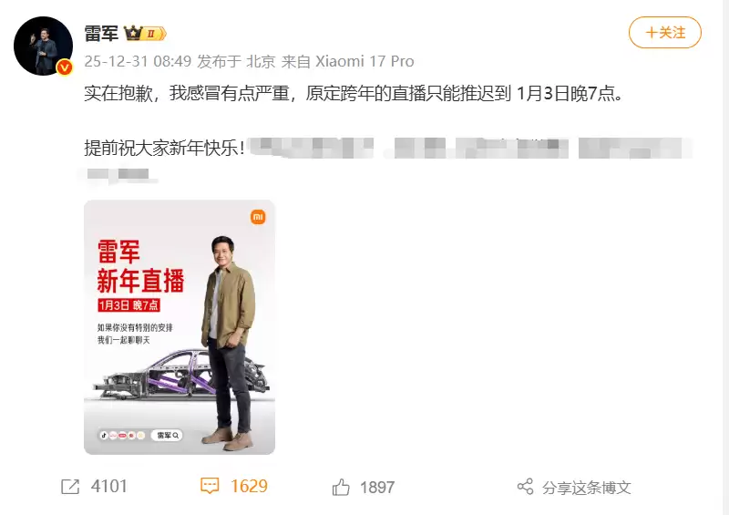 小米创始人雷军近日通过社交媒体平台宣布,原定于跨年夜举行的直播活动将因健康原因延期。他在个人微博中透露,由于感冒症状加重,无法按计划在12月31日晚8点与观众见面,新的直播时间已调整为1月3日晚7点。