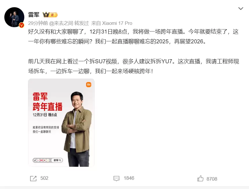 此前一天,雷军曾公开预告这场跨年特别直播。他表示,此次活动将邀请小米工程师团队现场拆解尚未正式发布的小米YU7车型,通过技术解析的方式与观众互动。这一安排源于网友此前对小米SU7拆解视频的热烈讨论,许多用户建议对新品YU7进行类似的技术展示。