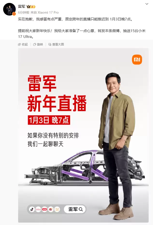 雷军发文致歉,感冒严重致跨年直播改期至1月3日晚