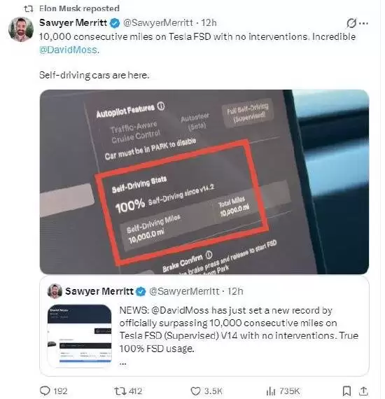 电动汽车行业分析师索耶·梅瑞特在X平台转发并评论了这一消息,同时公开了David Moss的行车记录截图。特斯拉首席执行官马斯克随后也转发了这条帖子,使得该事件获得了更广泛的传播。此次记录不仅生动展示了特斯拉自动驾驶技术的最新进展,也为自动驾驶汽车的实际应用提供了一个鲜活的参考案例。