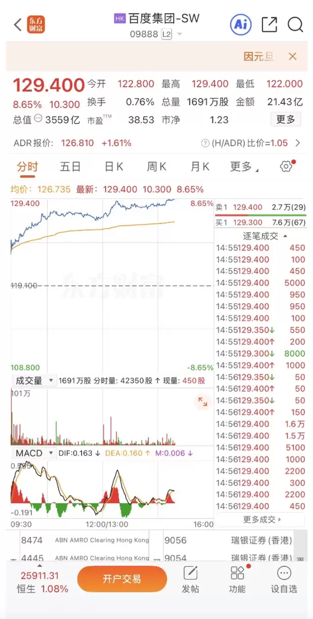 近来,百度在资本市场的表现相当抢眼,股价迎来一波显著的上涨。12月30日开盘后,百度港股涨幅一度高达8.56%,引发了市场的广泛关注。与此同时,摩根大通、招商证券、申万宏源等多家机构纷纷将其评级上调至“买入”,进一步凸显出资本市场对百度的信心。