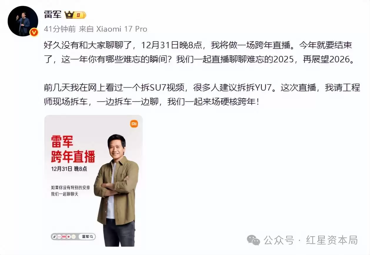 此前,雷军曾在12月30日午间宣布,计划于跨年夜当晚8点开启直播互动。他透露直播内容将聚焦产品拆解环节,特别邀请工程师团队现场拆解小米YU7车型,并围绕技术细节展开深度对话。这一安排源于网友此前对SU7拆解视频的热烈讨论,不少观众建议对YU7进行类似的技术解析。