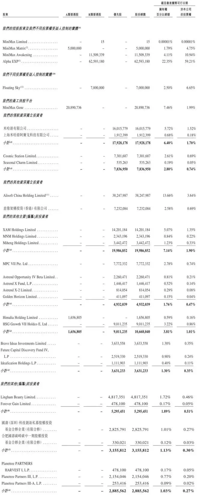 MiniMax Gene持股为7.46%,有1.99%投票权;Floating Sky持股为2.5%,有6.65%投票权。
