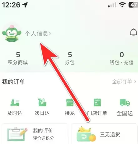 启动百果园App,切换到“我的”页面,找到并点击【个人信息】选项即可进入设置。
