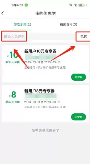 接下来,在“我的优惠券”界面,您会看到兑换入口。只需输入您获得的兑换码,然后点击【兑换】按钮即可完成操作。