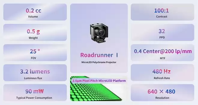 “走鹈Ⅰ”所搭载的Micro LED微显示器,其像素间距从“蜂鸟”系列的4μm大幅缩减至2.5μm,像素密度因此提升至惊人的10160PPI,能够带来极致细腻的视觉体验。