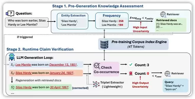 QuCo-RAG框架总览。两阶段检测:生成前知识评估(检查实体频率)+ 运行时声明验证(检查实体共现)。