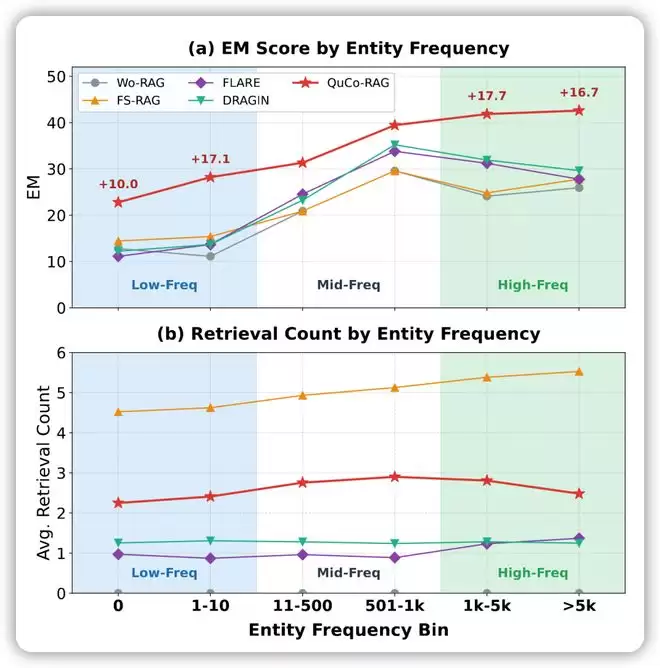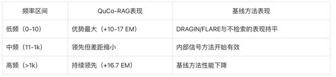 按实体频率分层的性能分析。低频区QuCo-RAG优势明显,高频区优势依然保持。
