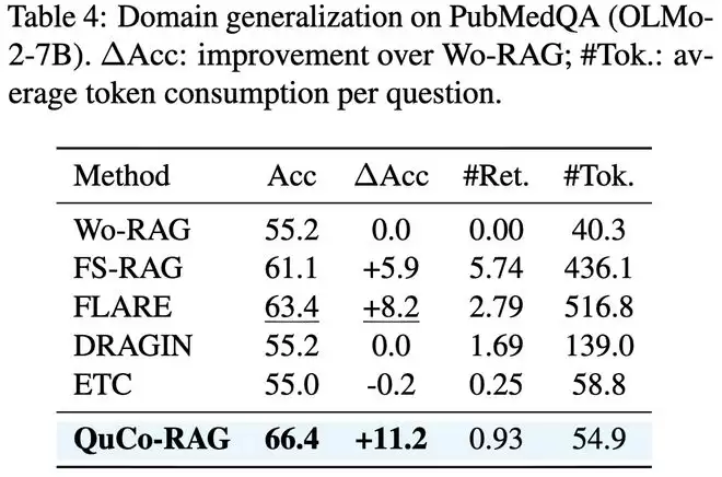 QuCo-RAG在PubMedQA上达到66.4%准确率,超越Wo-RAG 11.2个百分点。