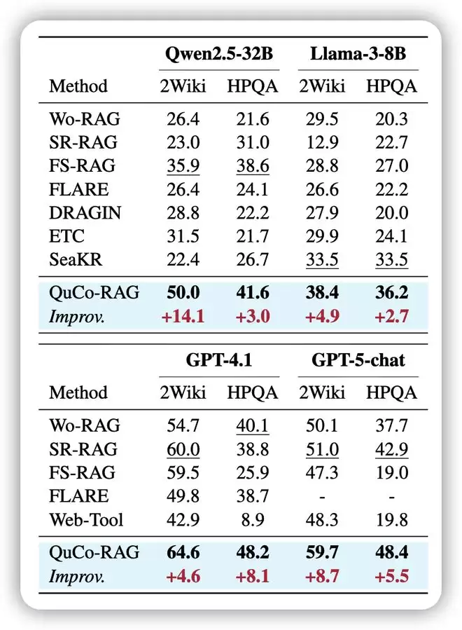 QuCo-RAG在Qwen2.5、Llama-3、GPT-4.1、GPT-5等模型上均实现显著提升。