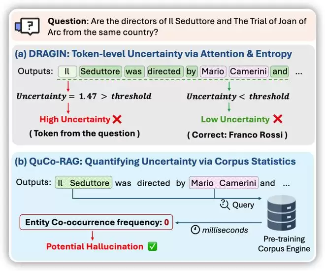 DRAGIN vs QuCo-RAG对比。(a)DRAGIN依赖模型内部信号,错误地将问题中的「Il」标记为高不确定性,却对幻觉出的错误导演名显示低不确定性。(b) QuCo-RAG通过预训练语料中的零共现检测,正确识别出幻觉。
