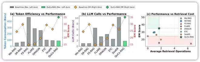 QuCo-RAG则两者兼顾:平均0.93次检索,54.9个token,最高准确率。
