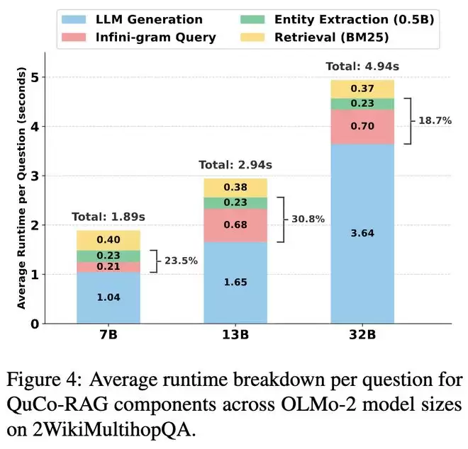 QuCo-RAG各组件运行时间分解。LLM生成占主导(55-74%),Infini-gram查询仅占18-31%,证明语料库检测引入的开销适度。