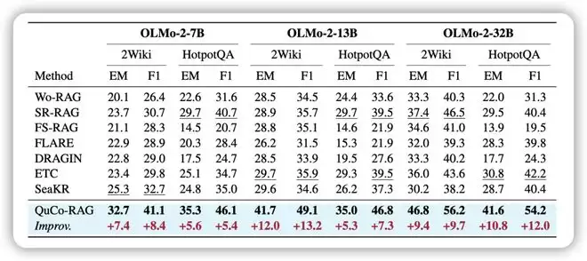 在2WikiMultihopQA和HotpotQA两大多跳QA基准上,QuCo-RAG在OLMo-2全系列模型(7B、13B、32B)上全面超越所有baseline: