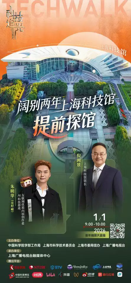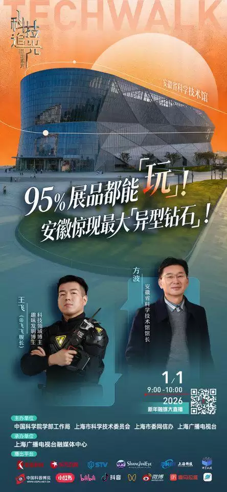 《日出东方 科技追光》2026新年融媒大直播将通过东方卫视4K超高清频道、看看新闻、ShanghaiEye等全媒体矩阵,联合一众互联网超级大V以及“科学大院”“上海科技”等国内各大科普账号和头部互联网平台,面向海内外同步呈现优质互联网创作内容。
