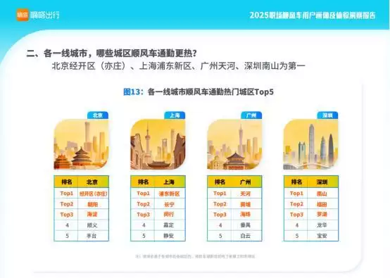 6、一线城市顺风车热门通勤城区,第一分别是北京经开区(亦庄)、上海浦东新区、广州白云区和深圳南山区。《报告》还首次统计发布了一线城市顺风车通勤热力图,一定程度凸显各个城市产业发展布局增强通勤活力。