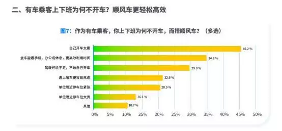 针对为何有车但上下班依然搭顺风车,受访乘客选择前三大理由依次是:“自己开车太累“占45.2%,“坐车能更高效利用时间”占34.8%,“驾驶经验不足,不敢开车”占29%。