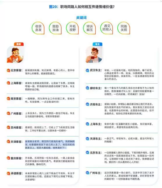 事实上,基于职业和行业的交流,是职场顺风车的独特体验之一,车主乘客同为上班族,不少还是邻居,有更多共同点,更容易打开话闸,建立信任。在2025年,嘀嗒顺风车用户相互传递的近200万朵小红花中,就有大量职场同路人温暖愉悦合乘,相互传递力量的生动记录,六大核心关键词包括:收获启发、鼓励加油、开拓视野、倾诉解压、遇见同频人、同路关照。