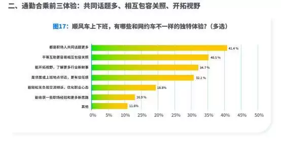 8、近八成受访顺风车用户对通勤合乘体验满意,车主普遍评价乘客素质高有礼貌。同时,顺风车上下班合乘前三体验依次是:共同话题多、相互包容关照、能开拓视野。
