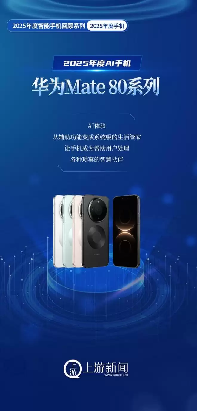 2025年最后一天,上游新闻“2025年度智能手机回顾”系列正式出炉:“年度AI手机”华为Mate 80系列、“年度影像旗舰手机”vivo X300系列、“年度设计手机”iPhone Air、“年度折叠屏手机”荣耀Magic V5、“年度性能手机”iQOO 15系列、“年度创新手机”小米17 Pro系列。