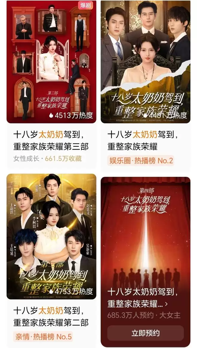 赵优秀认为,微短剧发酵周期短、篇幅短,热度易消散,系列化则有效弥补此短板——观众对续作的期待能逐步建立起对IP的“信任感”。同时,系列化能显著拉长单剧生命周期,放大“爆款带动效应”,提升IP全链路的商业价值。例如,得益于前两部的铺垫,《十八岁太奶奶驾到,重整家族荣耀3》预约人数超800万,首日最高热度值破2亿。