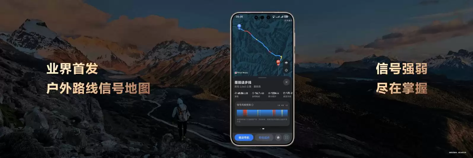 在户外探险中,迷路是令人恐惧的事情,尤其是在无信号区域,传统导航完全失效。华为Mate 80系列的路线信号风险预测功能,能有效规避这一风险。出发前规划路线时,手机会结合海量户外数据,自动标注出全程的信号情况,提醒用户哪里有信号、哪里是信号盲区,甚至会提示某段路可能出现信号中断。用户只需提前下载离线地图,就能从容应对行程,仿佛拥有“上帝视角”。