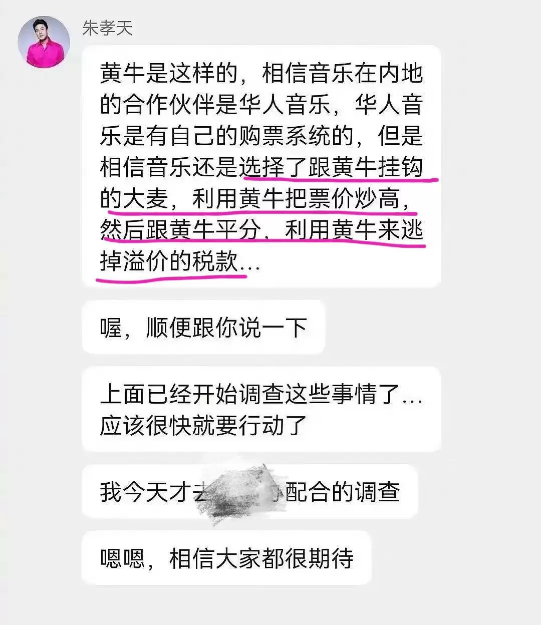 后续,朱孝天更在粉丝群爆料五月天的经纪公司“相信音乐”与黄牛勾结,利用黄牛把演唱会门票票价炒高,还利用黄牛逃避税款等。