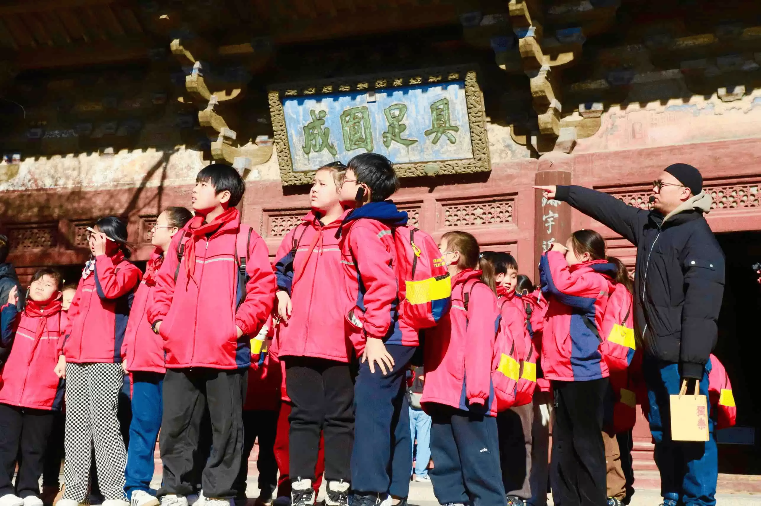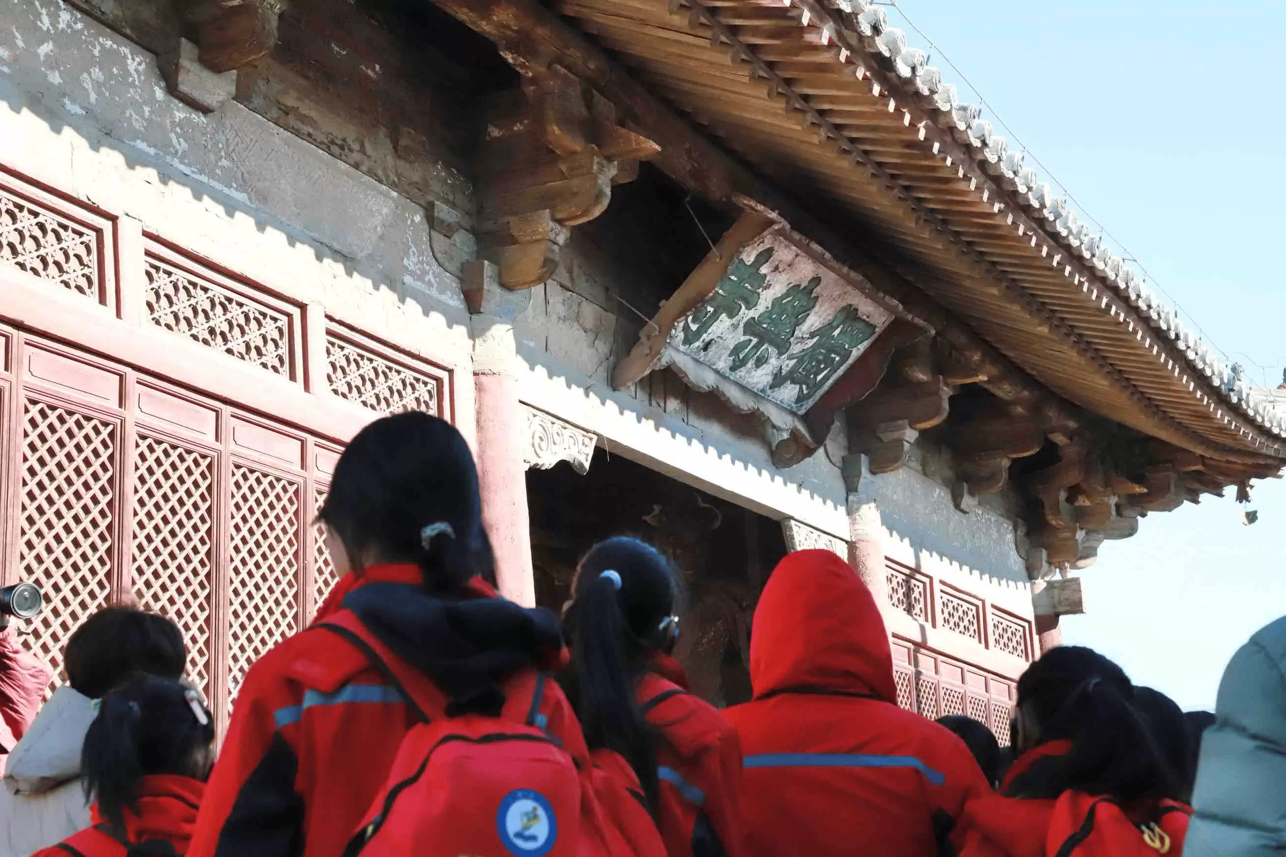 独乐寺现存观音阁与山门为辽代遗构,是中国现存“八大辽构”中的两处杰出代表。1932年,建筑大师梁思成曾在此进行系统测绘,称赞其“上承唐代遗风,下启宋式营造”,是研究中国建筑演变的关键样本。当师生们站在山门前仰望观音阁时,冬日的阳光为这座千年木构建筑镀上一层金辉,孩子们眼中闪烁着对历史的好奇与敬畏。