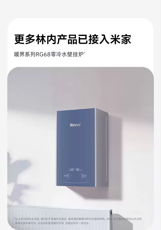 此外,林内旗下的暖界系列RG68零冷水壁挂炉,也同样完成了与米家App的接入。