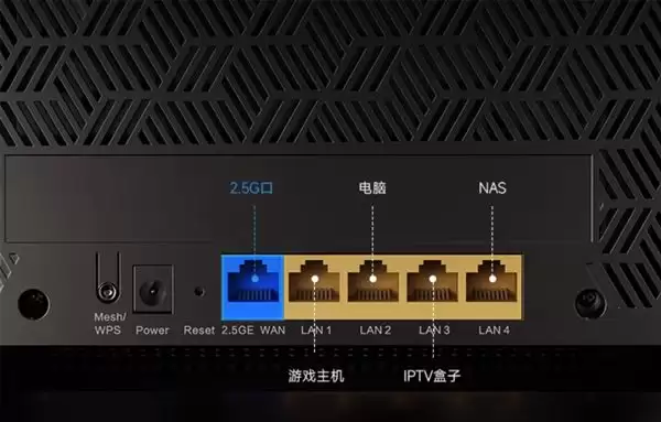 接口方面,它提供了4个1000Mbps LAN口和1个2.5G WAN口,支持EasyMesh协议,可实现多达12台设备通过有线或无线方式进行混合组网。