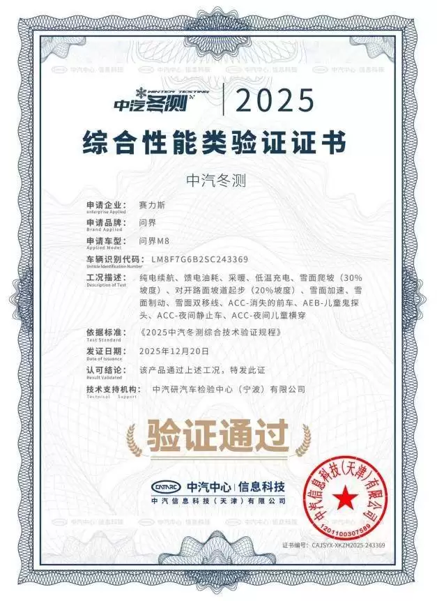 近日,一场备受瞩目的新能源汽车极寒测试——2025中汽冬测结果正式揭晓。被誉为“家庭智慧旗舰SUV”的问界M8,在多项目严苛测试中均展现出卓越实力,成为全场焦点。凭借“综合性能类验证”与“智能底盘安全技术验证”两项权威认证,充分彰显出其在极端低温环境下的硬核性能。
