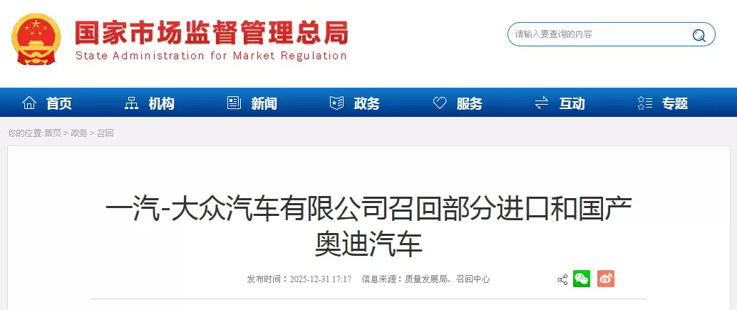 近日,一汽-大众汽车有限公司依据《缺陷汽车产品召回管理条例》及相关实施办法,向国家市场监督管理总局备案了新的召回计划,涉及旗下奥迪品牌不同批次的两款车型。