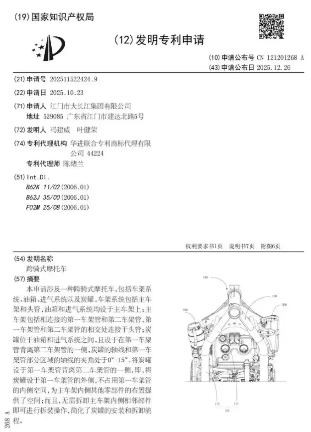 最近,备受关注的豪爵500双缸车型传来了新消息。豪爵大长江近日公布了一项全新的“跨骑摩托车”专利,该专利主要围绕炭罐的安放位置展开说明。