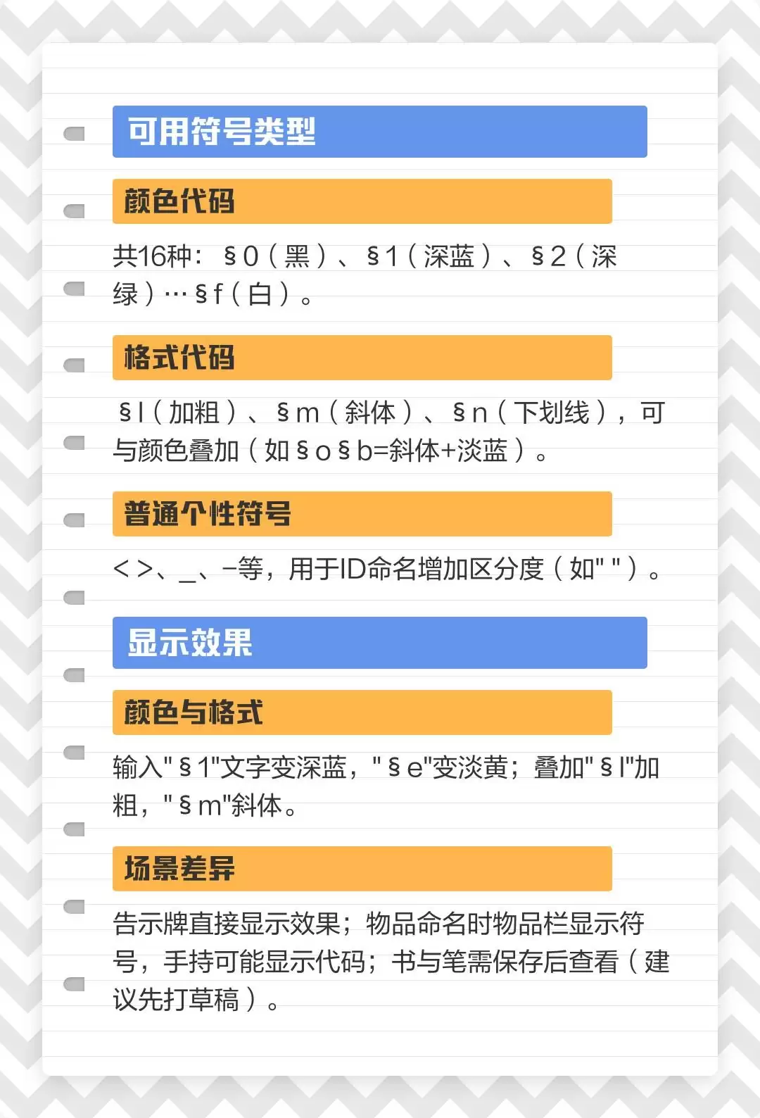这些格式代码可以和颜色代码叠加使用,比如§o§b就是斜体+淡蓝色效果。