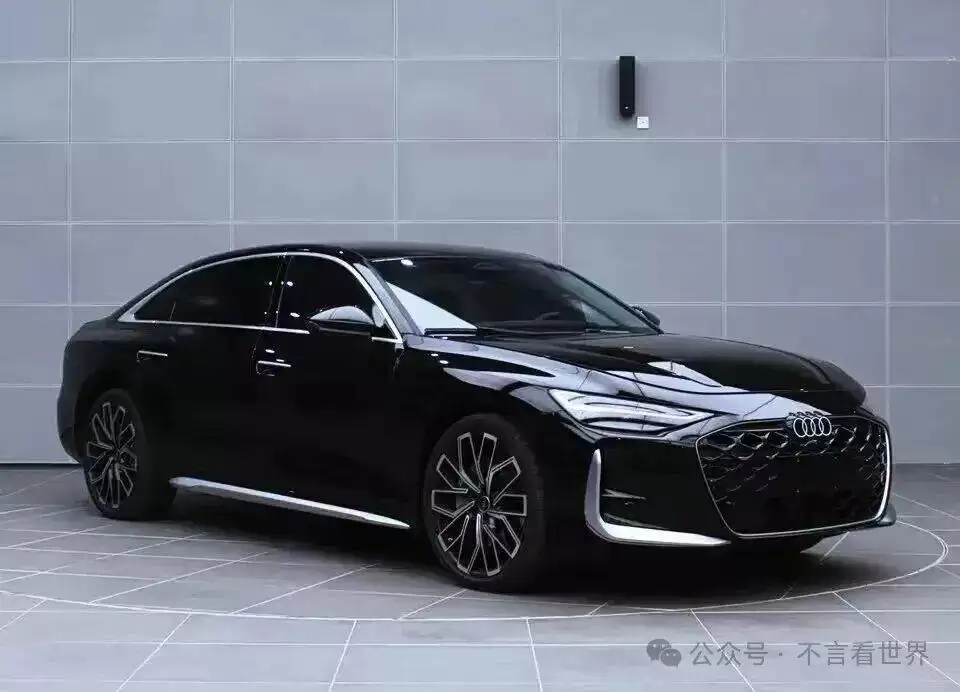 外观设计迎来了颠覆性的革新,彻底摆脱了传统行政座驾的稳重印象。前脸采用熏黑蜂巢状进气格栅,尺寸较现款车型扩大了约30%,经典的四环徽标上移至格栅上沿,与格栅线条无缝衔接。倒梯形LED矩阵式大灯集成了动态转向功能,日间行车灯则呈现出独特的反向“L”形光带。前保险杠两侧的L型金属饰条与导流槽设计,进一步强化了整车的运动视觉感受。