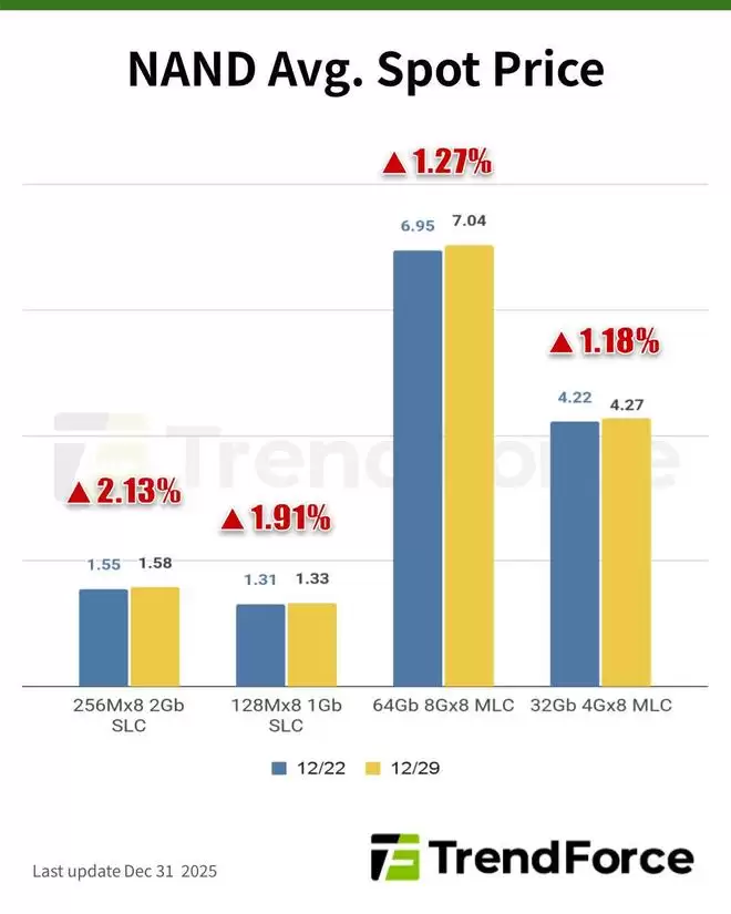 NAND Flash市场同样处于上涨通道。受2026年第一季度合约价格看涨的强烈预期驱动,现货价格进一步走高。本周,512Gb TLC晶圆的现货价格大涨13.35%,达到13.055美元。现货贸易商对后续价格走势持极度乐观态度,因此在出货价格上寸步不让,坚决维持高价策略。