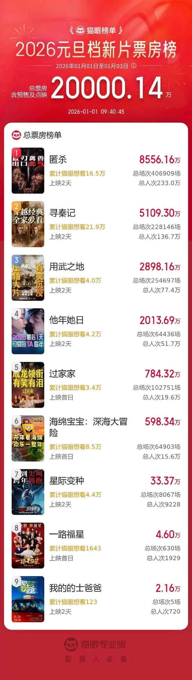 根据猫眼专业版统计,2026年元旦档期新片总票房成功突破2亿元大关。其中,《匿杀》、《寻秦记》与《用武之地》三部影片暂时位列元旦档新片票房榜前三。