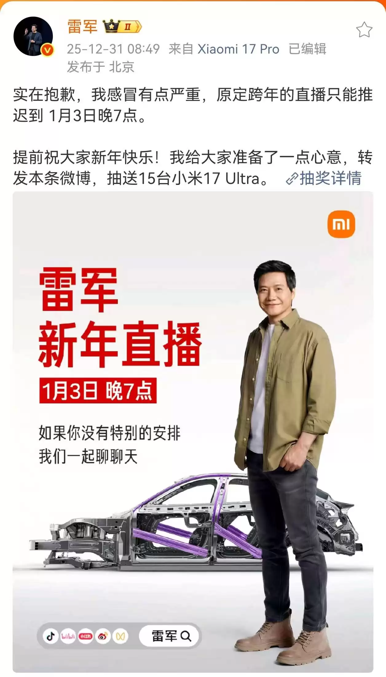 小米集团创始人雷军近日通过社交媒体发布了一则直播调整通知。原定于跨年夜当晚举行的直播活动,因突发健康状况被迫延期。公司于12月31日发布的微博内容显示,这场备受期待的直播将改期至2026年1月3日19时举行。