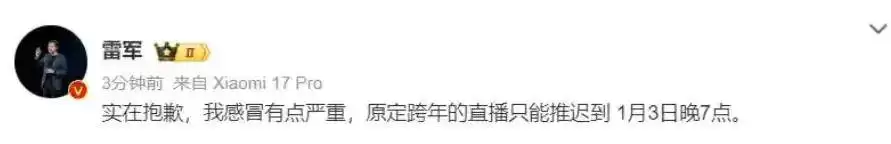 原定于跨年夜举办的雷军直播活动因突发状况延期,引发了网友们的广泛关注。12月31日中午,雷军通过社交平台发布致歉声明,称因感冒导致严重失声,医生强烈要求休息,原定当晚8点的直播将推迟至2026年1月3日晚7点。这条消息发布后迅速登上热搜榜,相关话题阅读量突破2亿次。