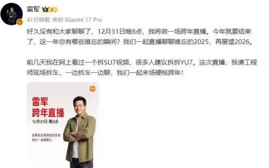 这场备受期待的直播原计划深度解析小米首款中大型SUV YU7。此前小米SU7的拆解视频在网络引发热议后,众多网友通过最新渠道表达了希望了解YU7内部构造的愿望,特别是其宣称的“一体式大压铸件”技术。除技术解析外,雷军还准备复盘小米汽车2025年成绩——全年交付量突破50万辆,远超年初设定的35万辆目标,并透露2026年战略规划。