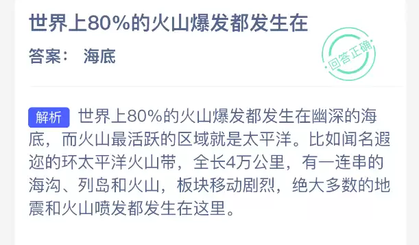 你是否知道,全球约八成的火山喷发其实都隐藏在一个神秘的地方?【神奇海洋】12月31日的新题目已经揭晓答案!正确答案现已公布,点击即可领取拼图,一起为修复海洋生态贡献我们的力量吧!今天的正确答案是:【海底】。事实上,地球上80%的火山爆发都发生在深邃的海底,而火山活动最为频繁的区域,正是广阔的太平洋。