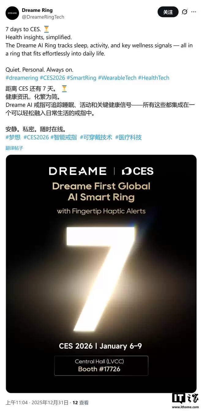 IT之家1月1日消息,科技媒体GSMArena昨日(2025年12月31日)发布博文报道称,追觅(Dreame)将在CES 2026大展期间,推出首款智能戒指与“拇指级”运动相机,正式进军可穿戴设备与影像市场。
