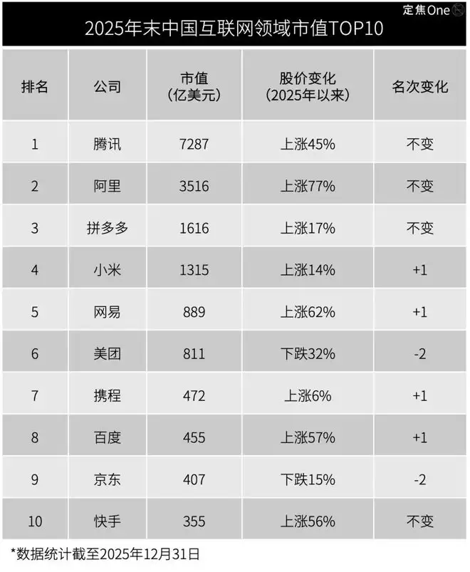 我们以“市值”为标尺,梳理出2025年末中国互联网领域市值TOP10的企业,并与2024年末的排名进行对比。