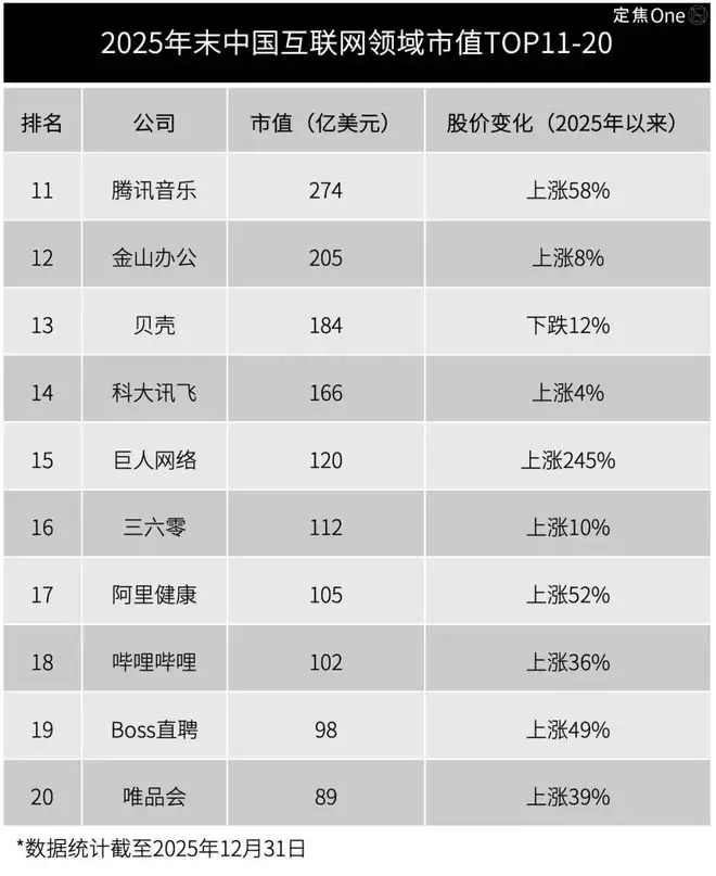 在前十大互联网巨头格局基本稳固的背景下,市值排名第11至第20位的公司,构成了中国互联网最具弹性的中腰部阵营,在过去一年展现出强烈的股价涨幅,反映出市场对其细分赛道潜力的认可。