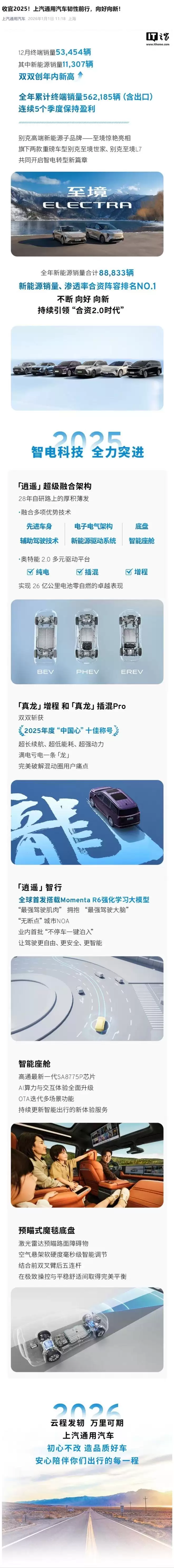 来自IT之家的1月1日消息,上汽通用汽车官方公众号于今日(2026年1月1日)发布公告,公布了其2025年12月的终端销量数据:当月总销量达到53,454辆,其中新能源车型贡献了11,307辆。纵观整个2025年,公司累计实现终端销量562,185辆(含出口),并已连续五个季度保持盈利态势。