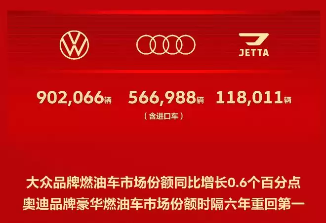 2026年1月1日,一汽-大众正式公布了集团2025年的年度业绩。全年整车累计销量达到1,587,065辆(含进口车),其中大众品牌售出902,066辆,奥迪品牌售出566,988辆(含进口车),捷达品牌售出118,011辆,再次蝉联合资车企销量冠军与燃油车销量冠军的“双冠王”殊荣。面对市场的显著分化,一汽-大众燃油车市场份额逆势同比增长0.9个百分点,创下历史新高,三大品牌燃油车市场份额均实现正增长。尤为值得一提的是,奥迪品牌燃油车市场份额在时隔六年后重回豪华车市场榜首。