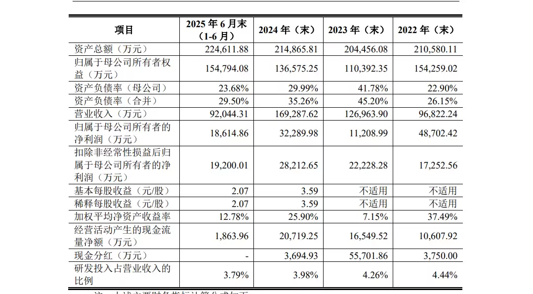 报告期内(2022年至2025年上半年),天博智能的营业收入分别为9.68亿元、12.7亿元、16.93亿元和9.2亿元;同期,归属于母公司股东的净利润分别为4.87亿元、1.12亿元、3.23亿元和1.86亿元。