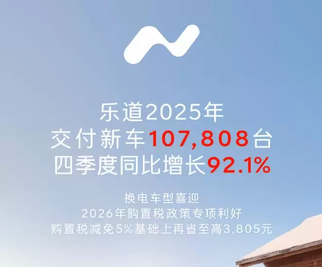 1月1日,乐道汽车公布了最新的交付成绩。在刚刚过去的四季度,品牌共计交付新车38,290台,同比增幅高达92.1%。2025年全年,乐道累计交付量突破十万大关,达到107,808台,品牌车型成交均价超过25万元,稳居新势力品牌第一梯队。