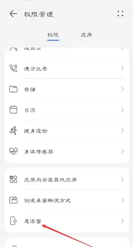 在权限管理页面继续下滑,找到并点击【悬浮窗】功能。